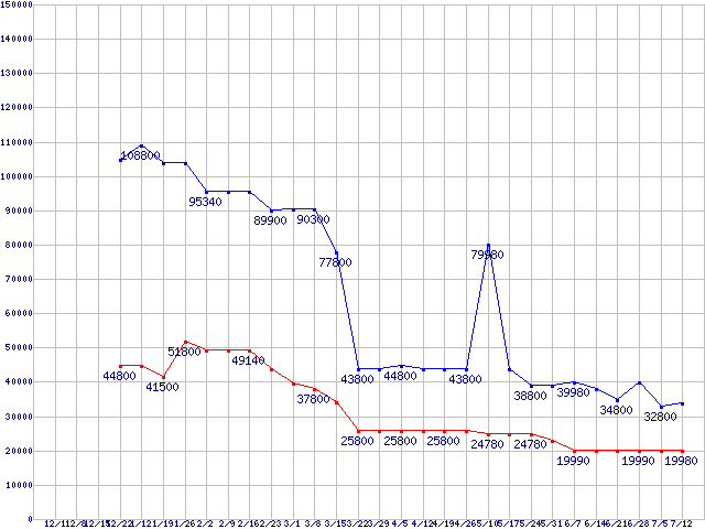 PC2-6400(DDR2-800) DDR2 SDRAM DIMMの最安値推移