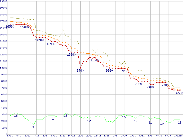 | Athlon X2 4800 (2.5GHz,L2 512KB×2)の価格推移 | | | (2007年5月11日~2008年7月18日) |