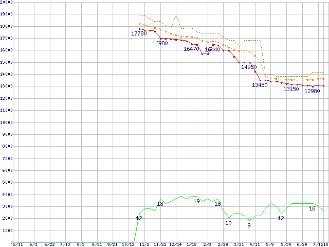 ※このグラフは過去のデータも税率5%相当に調整した税込み相当額のグラフです。 税率変更や、総額表示方式導入(2004年4月)の影響は除いています。 | | | ●凡例 | 最安値 (点線部は販売店未確認 または未調査) | 平均値 | 最高値 | ショップ数 |