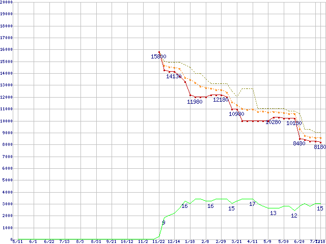 | Athlon X2 5200 (2.7GHz,L2 512KB×2)の価格推移 | | | (2007年5月11日~2008年7月18日) |