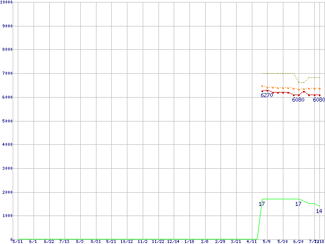 ※このグラフは過去のデータも税率5%相当に調整した税込み相当額のグラフです。 税率変更や、総額表示方式導入(2004年4月)の影響は除いています。 | | | ●凡例 | 最安値 (点線部は販売店未確認 または未調査) | 平均値 | 最高値 | ショップ数 |