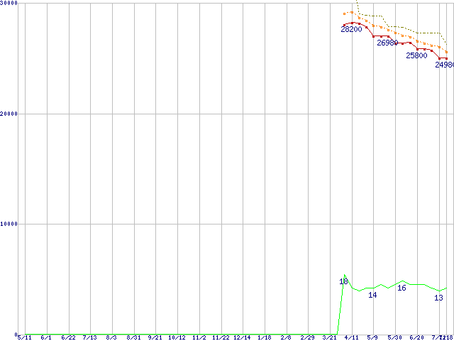 | Phenom X4 9850 Black Edition (2.5GHz,L2 512KB×4,L3 2MB)の価格推移 | | | (2007年5月11日~2008年7月18日) |