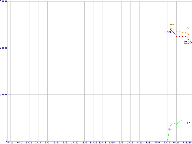 | Phenom X4 9750 (2.4GHz,L2 512KB×4,L3 2MB,TDP 95W)の価格推移 | | | (2007年5月11日~2008年7月18日) |
