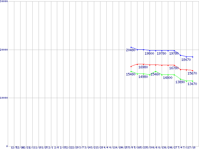 | Socket AM2 (HyperTransport 3.0,Triple Core,TDP 95W)の最安値推移 | | | (2007年12月7日~2008年7月18日) |