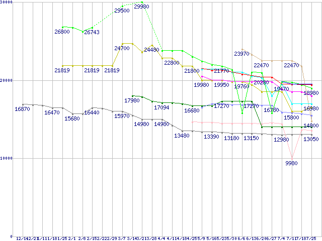 | CPU主要製品(最安値1万円~2万円未満)の最安値推移 | | | (2007年12月14日~2008年7月25日) |