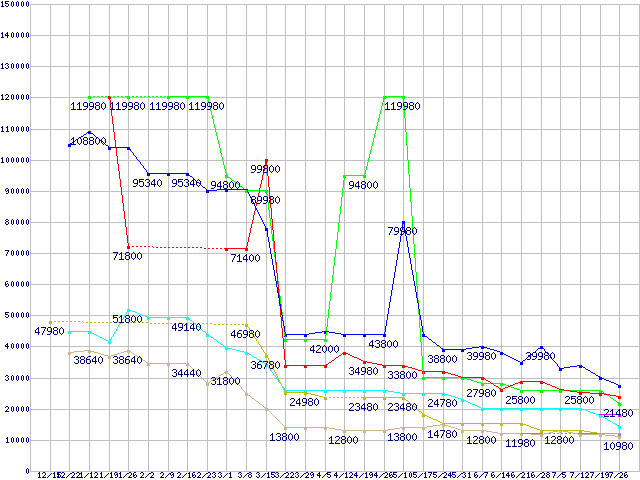 メモリ主要製品(最安値1万円以上)の最安値推移