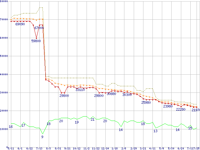 ※このグラフは過去のデータも税率5%相当に調整した税込み相当額のグラフです。 税率変更や、総額表示方式導入(2004年4月)の影響は除いています。 | | | ●凡例 | 最安値 (点線部は販売店未確認 または未調査) | 平均値 | 最高値 | ショップ数 |