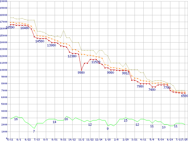 | Athlon X2 4800 (2.5GHz,L2 512KB×2)の価格推移 | | | (2007年5月11日~2008年7月25日) |