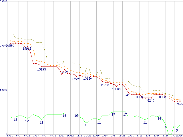 ※このグラフは過去のデータも税率5%相当に調整した税込み相当額のグラフです。 税率変更や、総額表示方式導入(2004年4月)の影響は除いています。 | | | ●凡例 | 最安値 (点線部は販売店未確認 または未調査) | 平均値 | 最高値 | ショップ数 |
