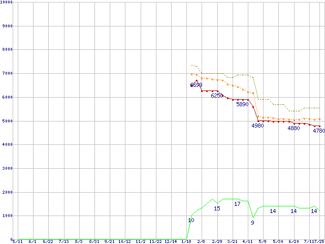 ※このグラフは過去のデータも税率5%相当に調整した税込み相当額のグラフです。 税率変更や、総額表示方式導入(2004年4月)の影響は除いています。 | | | ●凡例 | 最安値 (点線部は販売店未確認 または未調査) | 平均値 | 最高値 | ショップ数 |