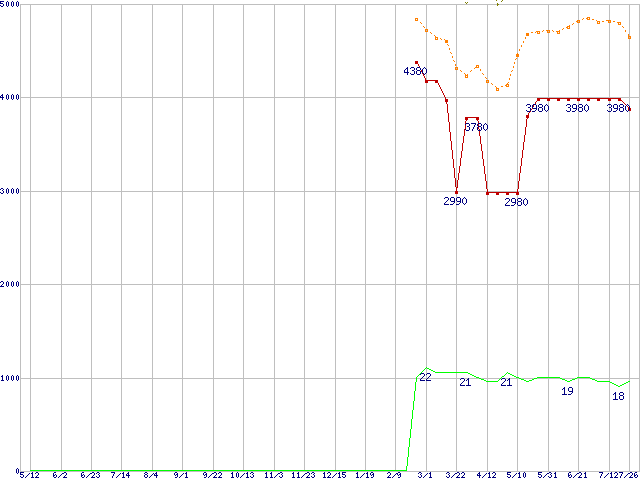 ※このグラフは過去のデータも税率5%相当に調整した税込み相当額のグラフです。 税率変更や、総額表示方式導入(2004年4月)の影響は除いています。 | | | ●凡例 | 最安値 (点線部は販売店未確認 または未調査) | 平均値 | 最高値 | ショップ数 |