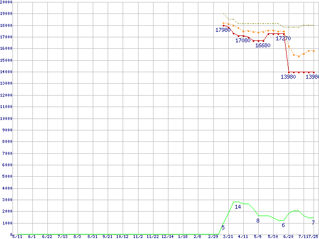 ※このグラフは過去のデータも税率5%相当に調整した税込み相当額のグラフです。 税率変更や、総額表示方式導入(2004年4月)の影響は除いています。 | | | ●凡例 | 最安値 (点線部は販売店未確認 または未調査) | 平均値 | 最高値 | ショップ数 |