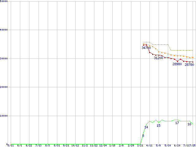 | Core 2 Quad Q9300 (2.5GHz,L2 3MB×2)の価格推移 | | | (2007年5月11日~2008年7月25日) |