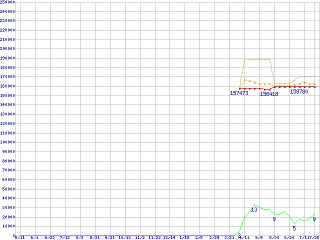 ※このグラフは過去のデータも税率5%相当に調整した税込み相当額のグラフです。 税率変更や、総額表示方式導入(2004年4月)の影響は除いています。 | | | ●凡例 | 最安値 (点線部は販売店未確認 または未調査) | 平均値 | 最高値 | ショップ数 |