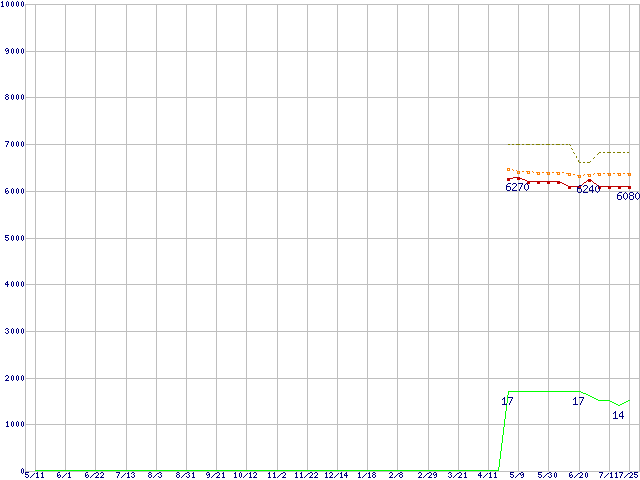 ※このグラフは過去のデータも税率5%相当に調整した税込み相当額のグラフです。 税率変更や、総額表示方式導入(2004年4月)の影響は除いています。 | | | ●凡例 | 最安値 (点線部は販売店未確認 または未調査) | 平均値 | 最高値 | ショップ数 |