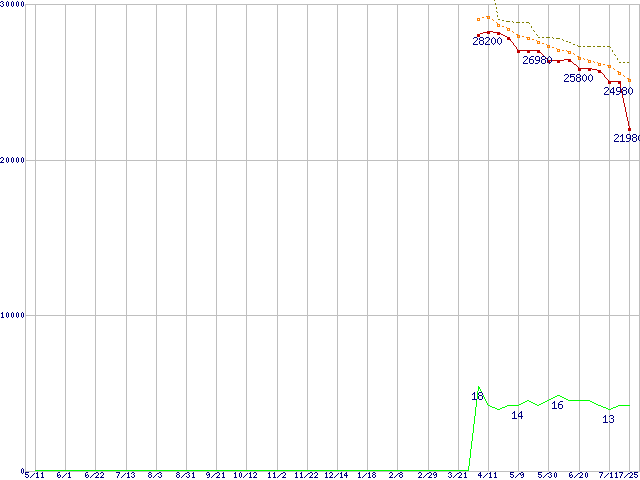 ※このグラフは過去のデータも税率5%相当に調整した税込み相当額のグラフです。 税率変更や、総額表示方式導入(2004年4月)の影響は除いています。 | | | ●凡例 | 最安値 (点線部は販売店未確認 または未調査) | 平均値 | 最高値 | ショップ数 |