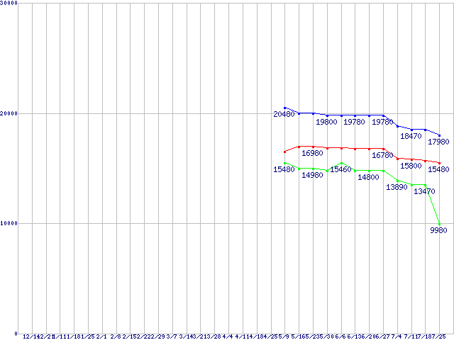 | Socket AM2 (HyperTransport 3.0,Triple Core,TDP 95W)の最安値推移 | | | (2007年12月14日~2008年7月25日) |