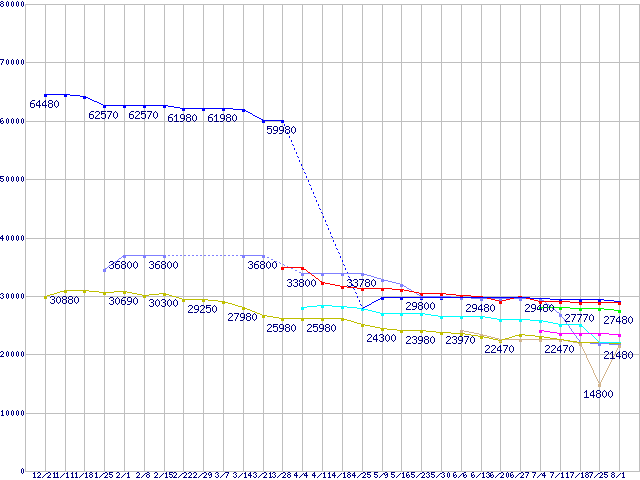 | CPU主要製品(最安値2万円~3万円未満)の最安値推移 | | | (2007年12月21日~2008年8月1日) |