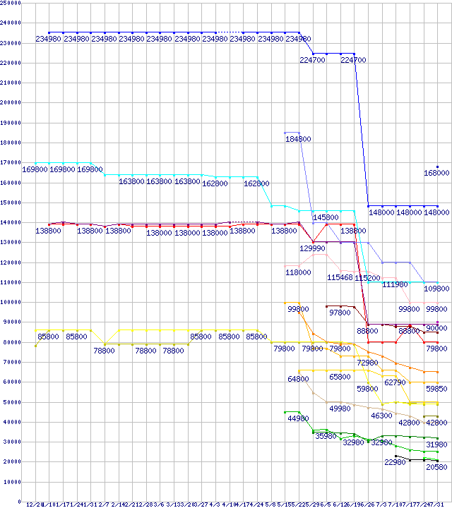 | HDD/SSD主要製品(最安値2万円以上)の最安値推移 | | | (2007年12月20日~2008年7月31日) |