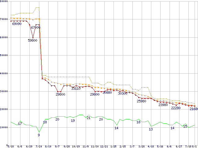 | Core 2 Quad Q6600 (2.40GHz,L2 4MB×2)の価格推移 | | | (2007年5月18日~2008年8月1日) |