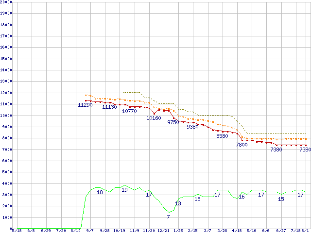 | Pentium Dual-Core E2180 (2.0GHz)の価格推移 | | | (2007年5月18日~2008年8月1日) |