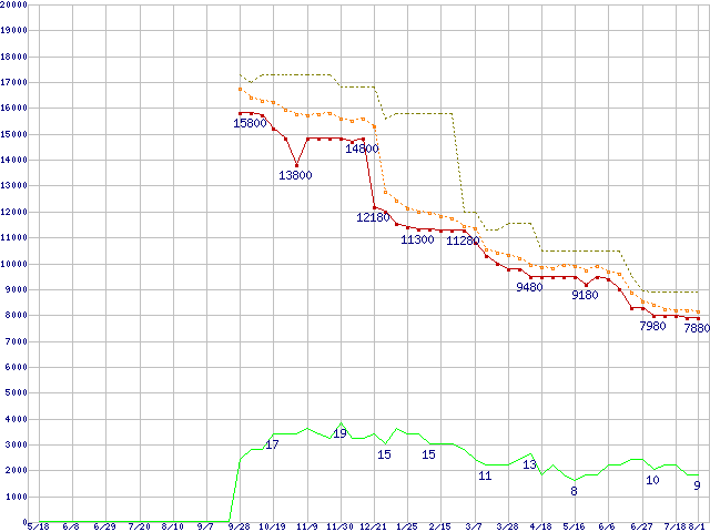 ※このグラフは過去のデータも税率5%相当に調整した税込み相当額のグラフです。 税率変更や、総額表示方式導入(2004年4月)の影響は除いています。 | | | ●凡例 | 最安値 (点線部は販売店未確認 または未調査) | 平均値 | 最高値 | ショップ数 |