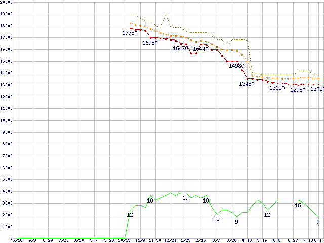 ※このグラフは過去のデータも税率5%相当に調整した税込み相当額のグラフです。 税率変更や、総額表示方式導入(2004年4月)の影響は除いています。 | | | ●凡例 | 最安値 (点線部は販売店未確認 または未調査) | 平均値 | 最高値 | ショップ数 |