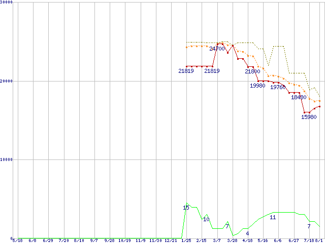 | Core 2 Duo E8200 (2.66GHz,L2 6MB)の価格推移 | | | (2007年5月18日~2008年8月1日) |