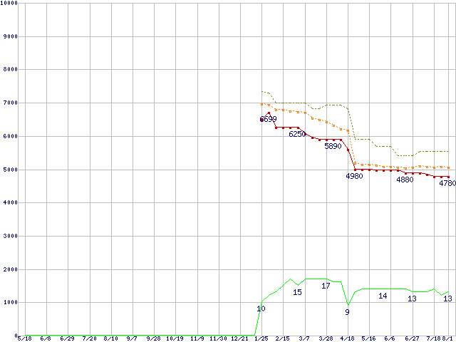 ※このグラフは過去のデータも税率5%相当に調整した税込み相当額のグラフです。 税率変更や、総額表示方式導入(2004年4月)の影響は除いています。 | | | ●凡例 | 最安値 (点線部は販売店未確認 または未調査) | 平均値 | 最高値 | ショップ数 |