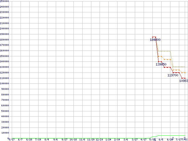 ※このグラフは過去のデータも税率5%相当に調整した税込み相当額のグラフです。 税率変更や、総額表示方式導入(2004年4月)の影響は除いています。 | | | ●凡例 | 最安値 (点線部は販売店未確認 または未調査) | 平均値 | 最高値 | ショップ数 |