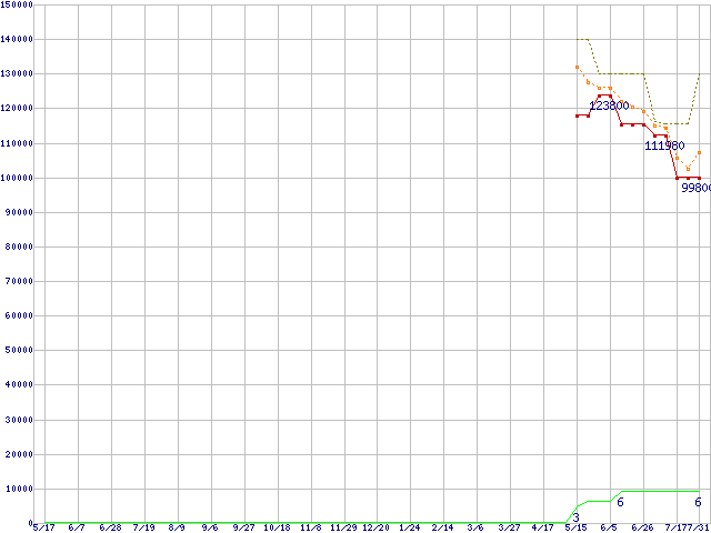 ※このグラフは過去のデータも税率5%相当に調整した税込み相当額のグラフです。 税率変更や、総額表示方式導入(2004年4月)の影響は除いています。 | | | ●凡例 | 最安値 (点線部は販売店未確認 または未調査) | 平均値 | 最高値 | ショップ数 |