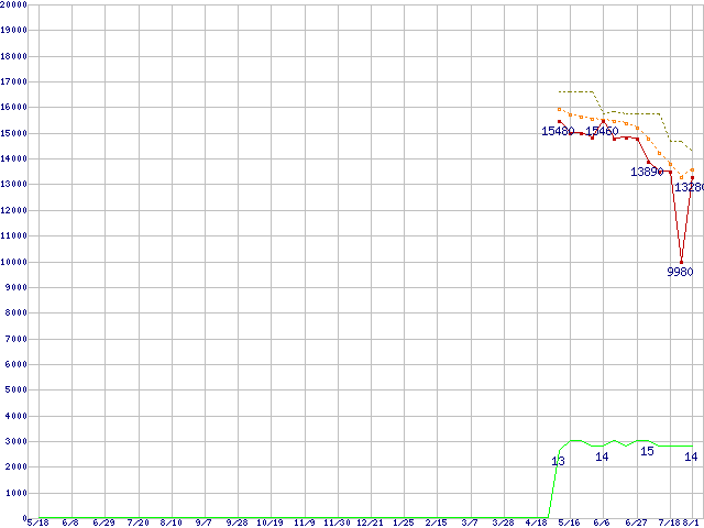 ※このグラフは過去のデータも税率5%相当に調整した税込み相当額のグラフです。 税率変更や、総額表示方式導入(2004年4月)の影響は除いています。 | | | ●凡例 | 最安値 (点線部は販売店未確認 または未調査) | 平均値 | 最高値 | ショップ数 |