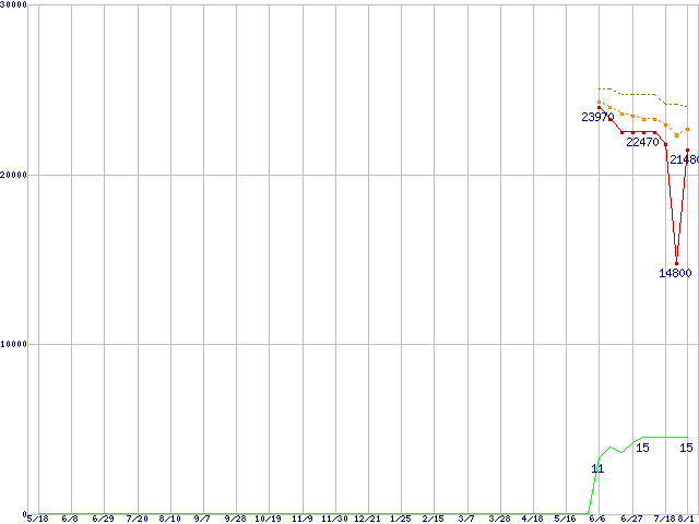 | Phenom X4 9750 (2.4GHz,L2 512KB×4,L3 2MB,TDP 95W)の価格推移 | | | (2007年5月18日~2008年8月1日) |