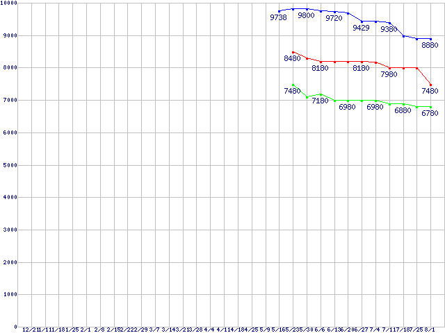 | Socket AM2 (HyperTransport,Dual Core,TDP 45W)の最安値推移 | | | (2007年12月21日~2008年8月1日) |
