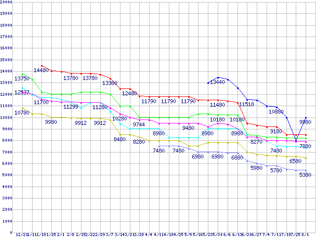 | Socket AM2 (HyperTransport,Dual Core,TDP 65W)の最安値推移 | | | (2007年12月21日~2008年8月1日) |