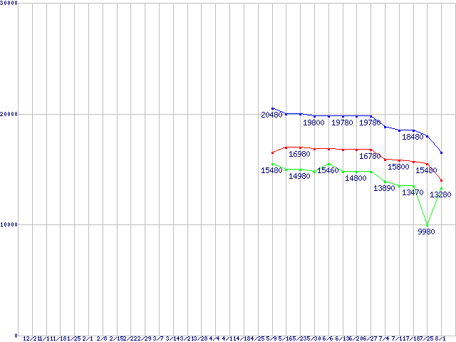 | Socket AM2 (HyperTransport 3.0,Triple Core,TDP 95W)の最安値推移 | | | (2007年12月21日~2008年8月1日) |