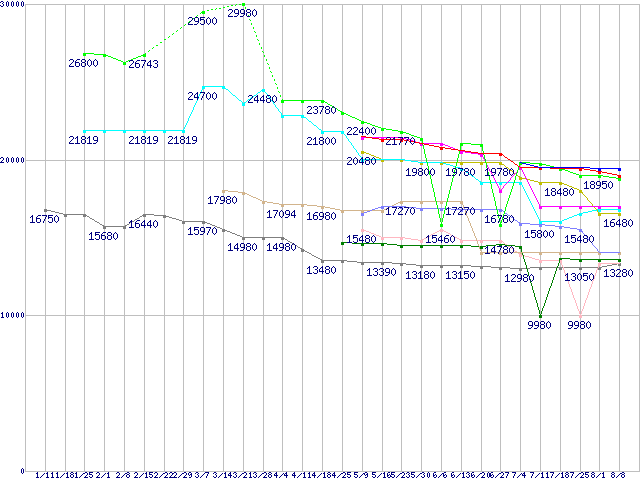 | CPU主要製品(最安値1万円~2万円未満)の最安値推移 | | | (2008年1月11日~2008年8月8日) |