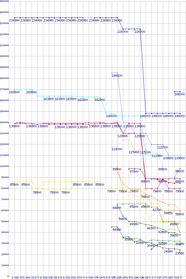 | HDD/SSD主要製品(最安値2万円以上)の最安値推移 | | | (2008年1月10日~2008年8月7日) |
