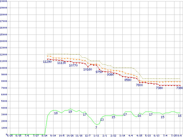 | Pentium Dual-Core E2180 (2.0GHz)の価格推移 | | | (2007年5月25日~2008年8月8日) |