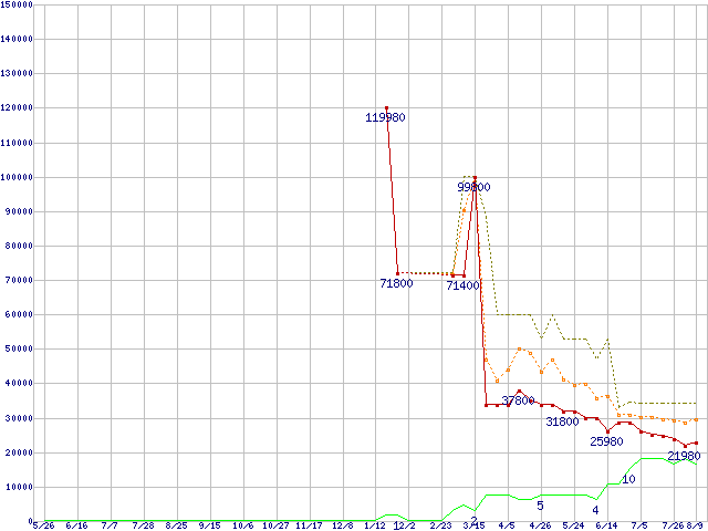 ※このグラフは過去のデータも税率5%相当に調整した税込み相当額のグラフです。 税率変更や、総額表示方式導入(2004年4月)の影響は除いています。 | | | ●凡例 | 最安値 (点線部は販売店未確認 または未調査) | 平均値 | 最高値 | ショップ数 |