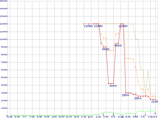 ※このグラフは過去のデータも税率5%相当に調整した税込み相当額のグラフです。 税率変更や、総額表示方式導入(2004年4月)の影響は除いています。 | | | ●凡例 | 最安値 (点線部は販売店未確認 または未調査) | 平均値 | 最高値 | ショップ数 |