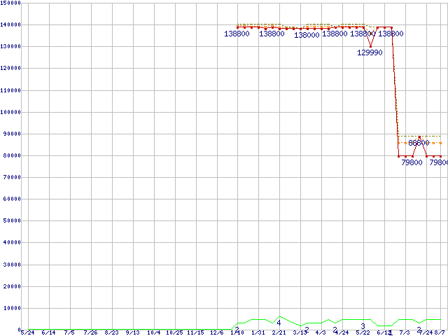 ※このグラフは過去のデータも税率5%相当に調整した税込み相当額のグラフです。 税率変更や、総額表示方式導入(2004年4月)の影響は除いています。 | | | ●凡例 | 最安値 (点線部は販売店未確認 または未調査) | 平均値 | 最高値 | ショップ数 |