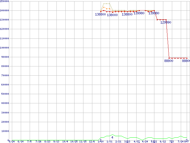 ※このグラフは過去のデータも税率5%相当に調整した税込み相当額のグラフです。 税率変更や、総額表示方式導入(2004年4月)の影響は除いています。 | | | ●凡例 | 最安値 (点線部は販売店未確認 または未調査) | 平均値 | 最高値 | ショップ数 |