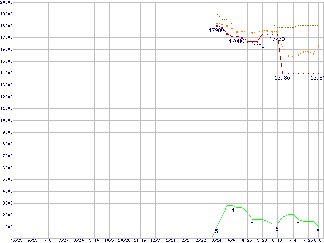 ※このグラフは過去のデータも税率5%相当に調整した税込み相当額のグラフです。 税率変更や、総額表示方式導入(2004年4月)の影響は除いています。 | | | ●凡例 | 最安値 (点線部は販売店未確認 または未調査) | 平均値 | 最高値 | ショップ数 |