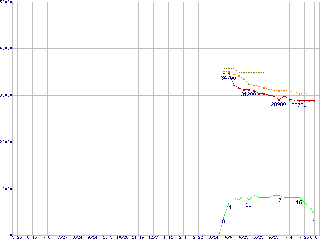 | Core 2 Quad Q9300 (2.5GHz,L2 3MB×2)の価格推移 | | | (2007年5月25日~2008年8月8日) |