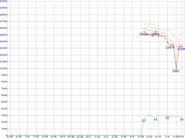 | Phenom X3 8450 (2.1GHz,L2 512KB×3,L3 2MB)の価格推移 | | | (2007年5月25日~2008年8月8日) |