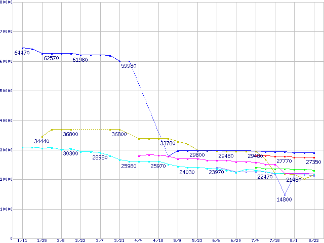 | CPU主要製品(最安値2万円~3万円未満)の最安値推移 | | | (2008年1月11日~2008年8月22日) |