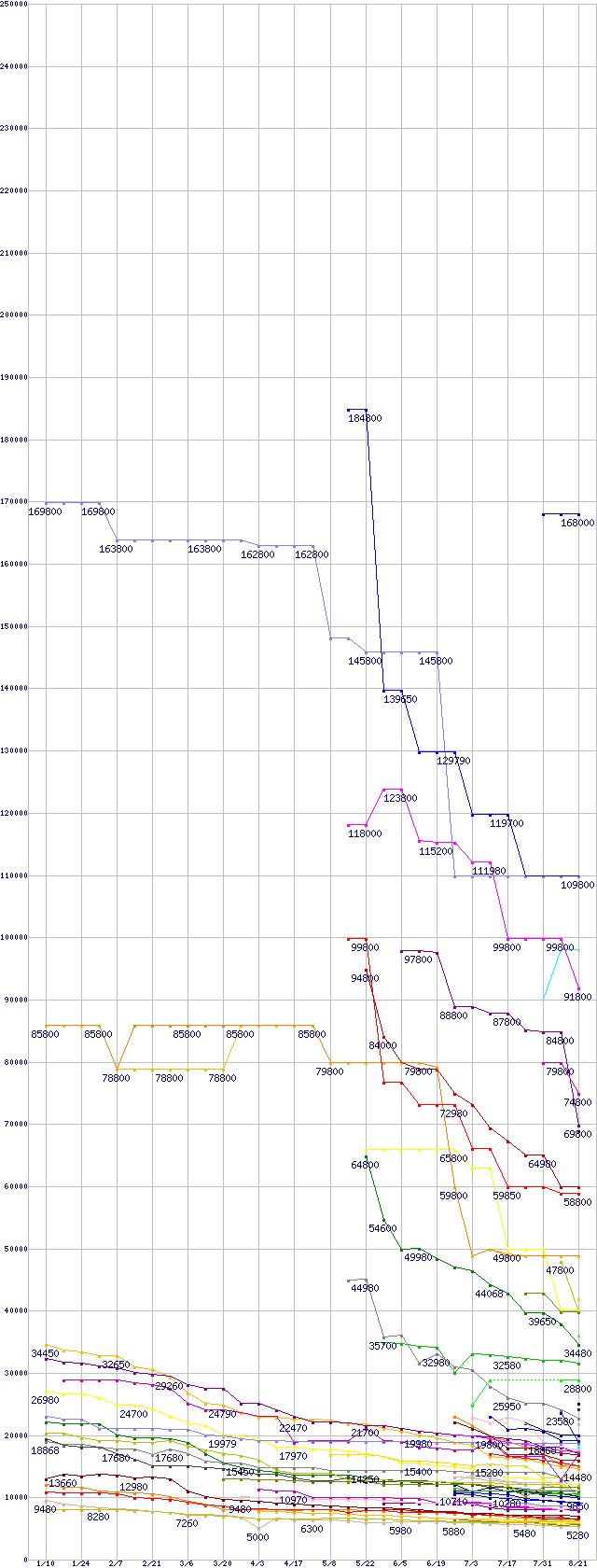 | HDD/SSD主要製品の最安値推移 | | | (2008年1月10日~2008年8月21日) |