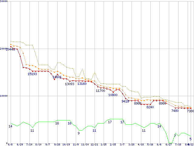 | Athlon 64 X2 5000+ (2.6GHz,L2 512KB×2)の価格推移 | | | (2007年6月8日~2008年8月22日) |