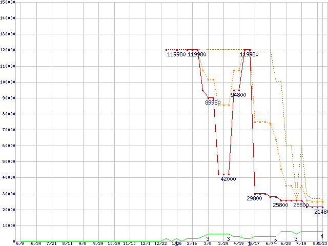 ※このグラフは過去のデータも税率5%相当に調整した税込み相当額のグラフです。 税率変更や、総額表示方式導入(2004年4月)の影響は除いています。 | | | ●凡例 | 最安値 (点線部は販売店未確認 または未調査) | 平均値 | 最高値 | ショップ数 |